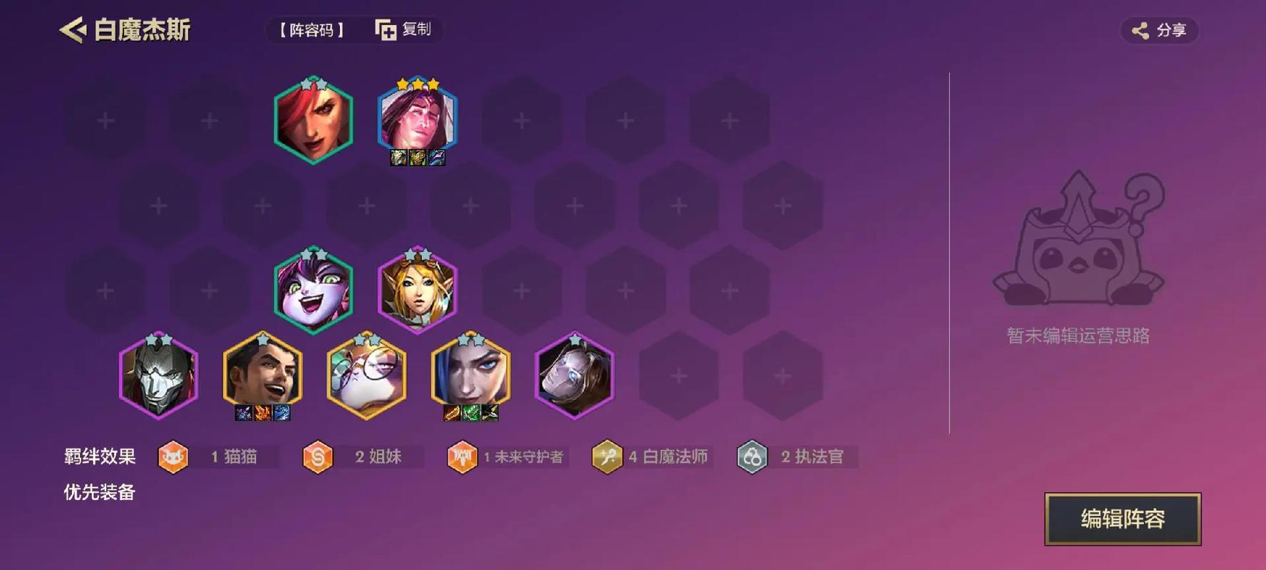 过渡阵容建议2卡莎+2芮尔+尼菈+锐雯/薇恩。后期追三星:4-1左右升7人口,上2卡莎+2尼菈+2芮尔+1薇恩。之后开始追阵容内所有棋子三星。在卡莎三星后就可升级8人口,如果芮尔没有三星也可用2个艾克代替,之后继续追所有棋子三星。
