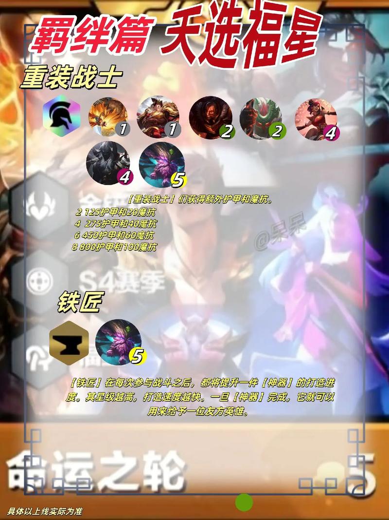 〖Two〗、金铲铲之战s4所有羁绊效果汇总宗师效果:在战斗开始时,宗师会降低敌人50%攻击速度.『2』 持续3秒『3』 持续5秒『4』 持续8秒重装战士效果:重装战士们获得额外护甲。『2』 100护甲『4』 200护甲『6』 500护甲月神效果:把星级最低的月神英雄增加1星,如果等级一样那么就选装备比较多的。