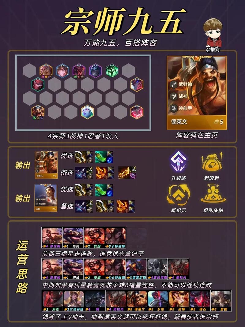 阵容组成 核心英雄:刀妹、锐雯、乌鸦(斯维因)、狗头、永恩、奥拉夫、莫甘娜、小炮、德莱文羁绊组成 1武财神:提供额外的经济收益。3战神:战神英雄获得额外的攻击力和法术强度,并在参与击杀后回复生命值。4摄魂使:摄魂使们用攻击和技能造成伤害时会治疗自身,治疗量基于造成的伤害值。