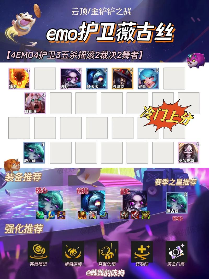 〖One〗、阵容羁绊:- 核心羁绊:4EMO、6舞者、2护卫。 搭配推荐:- 海克斯强化: - 银:潘朵拉的装备、白银面纱、酷热打击、治疗法球、百宝袋等。 - 金:情感连接、参天巨人的坚决、屈服于深渊、治疗法球、潘朵拉的装备等。 - 彩:棱彩门票、新人入队、大师级星探、对冲基金、升级咯等。