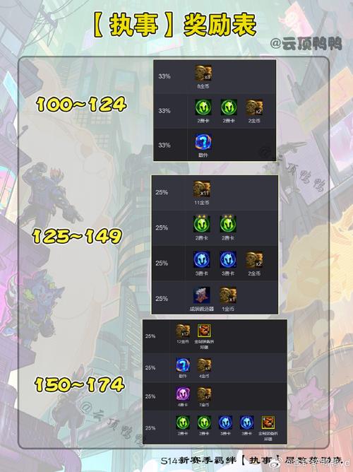 主要奖励:金币和弈子等基础资源。100-149层奖励:125-149层:成装锻造器、金制拆卸器等装备道具,以及概率获得2星2费弈子、3费弈子等。150-199层奖励:158-174层:随机4费弈子、次级英雄复制器等。175-199层:窃贼手套等高价值装备,以及大量的3费弈子。