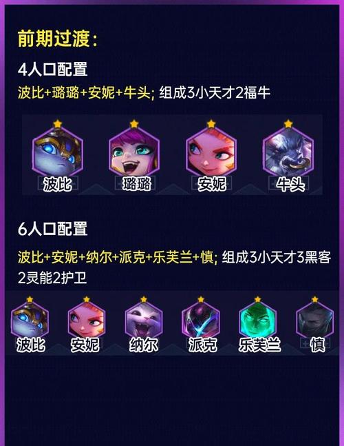 阵容站位 前排吃鸟盾时抱团站,不吃鸟盾时稍微分散以防AOE伤害。 卡牌没电刀时,注意与离子火花怪站在一侧。搜牌节奏 7级前不D牌,如果过渡顺利,7级也可不D,不顺则直接启动小D找4福牛4灵能,至少1张卡牌带装备,同时确保安妮、牛头、琴女等2/3费体系卡整体2星,再存钱拉8。
