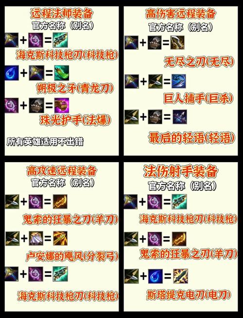 卡牌崔斯特:必备装备为电刀(反曲弓+女神泪)和羊刀(无用大棒+反曲弓),第三件装备可选取法爆(无用大棒+拳套)。备选装备包括大帽子、正义、巨杀、破防者。安妮:救赎(巨人腰带+女神泪)、反甲(锁子甲+锁子甲)、龙牙(负极斗篷+负极斗篷)。备选装备包括狂徒、日炎、石像鬼、泰坦等。