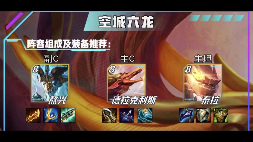 〖Three〗、阵容羁绊:3神龙烈焰、3强袭炮手、3金鳞龙等。阵容分析:炮手被加强,输出高,但害怕赛芬和刺客。狂刃永恩:阵容羁绊:6幻境龙、4狂刃战士等。阵容分析:依赖三星永恩,成型后克制一切,但害怕同行。6332玉龙迭嘉:阵容羁绊:6幻境龙、3玉龙、3神龙尊者等。