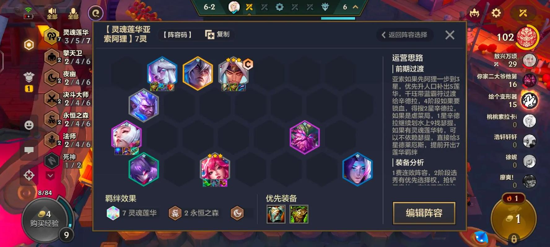 〖Four〗、灵魂莲华连线:瑟提没来前,连锤石+阿狸;瑟提来以后,连瑟提+锤石。亚索如果出纯肉站如图位,如果出汲取剑+泰坦,则站到瑟提位置,奥恩放上来,后排人可以不吃夜幽格。2阶段不升级,3-1启动搜牌,重点搜3星亚索阿狸德莱厄斯,约里克抓到2星即可。