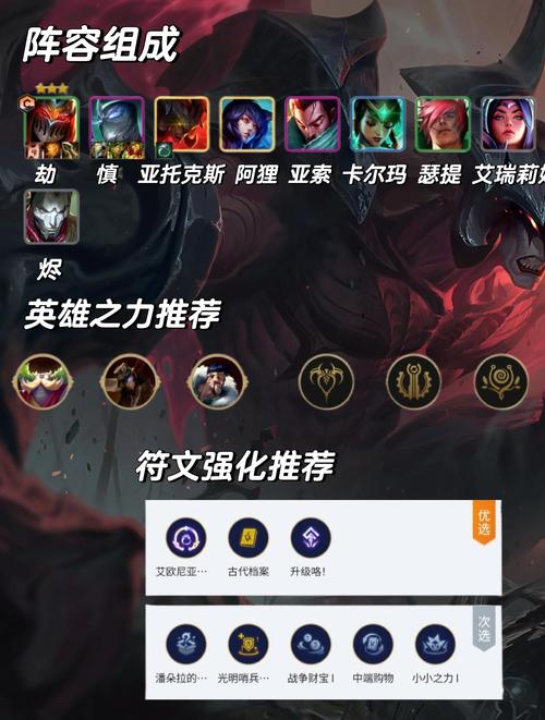 推荐英雄:塔姆、卡莎、蔚、阿狸、艾克、慎、卡尔玛等。这些英雄可以组成多种强力羁绊,如格斗家、学者、枪手等,特别是格斗家羁绊能大幅提升队伍的整体战斗力。装备选取 塔姆装备:优先配备日炎斗篷(开场削弱敌方前排)、狂徒铠甲(提升生存能力)和离子火花(对周围敌人造成魔法伤害并降低其魔抗)。