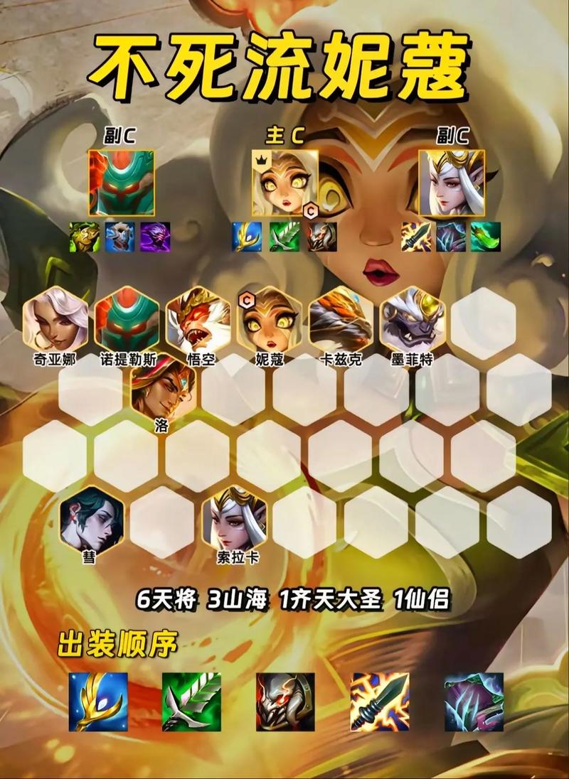 标准阵容:7山海绘卷、2幽魂、2护卫、2法师、2狙神、2神谕、1画圣。9人口为究极大成,最佳配置是拥有山海绘卷转职,8人口即可开出7山海绘卷。核心英雄:妮蔻作为主C兼主T,其他关键英雄包括大嘴(副C)、莉莉娅(副C)和泰坦(副T)。装备推荐 妮蔻:饮血剑、泰坦的坚决、大天使之杖/守护天使。
