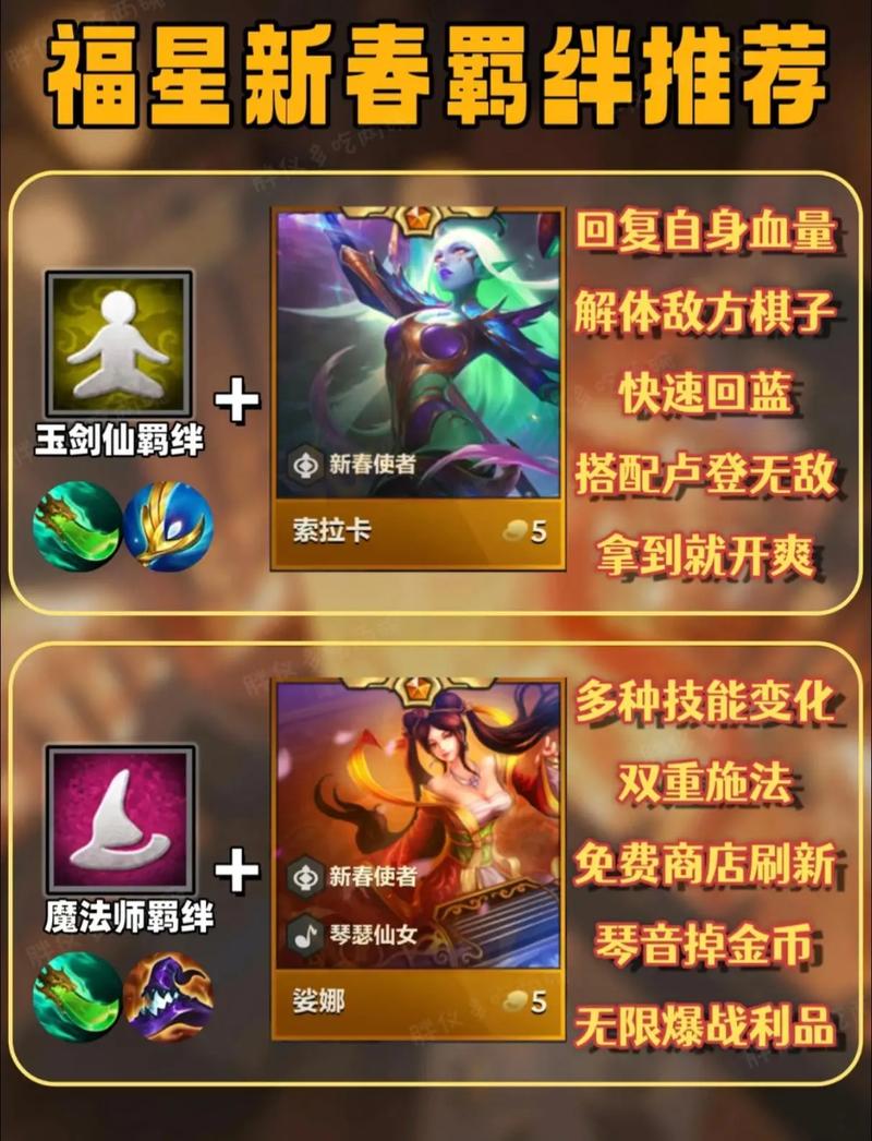福星羁绊效果:- 在赢得与玩家镇羡慎的战斗后,玩家将获得额外的战利品法球。- 玩家获得法球的时间越长,额外掉落的战利品法球也将越丰厚。- 胜利后,玩家会获得额外金币。 当福星达到6御敬时,胜利后将有机会获得装备奖励或妮蔻之助。推荐的福星阵容包括:塔姆、安妮、金克斯、卡派李特和猪妹。