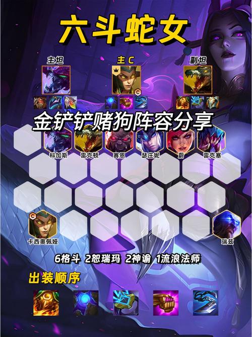 赌狗阵容核心成员赌狗阵容以低费卡为核心,通过早期D牌快速提升质量形成压制。核心成员包括:卡莉斯塔(主C):装备优先选取羊刀、穿甲弓,第三件可选无尽、巨杀或正义之手。其输出能力依赖攻速与破甲,是阵容主要输出点。亚托克斯(副C):装备龙牙、反甲或石像鬼板甲,泰坦可替换为饮血或日炎。