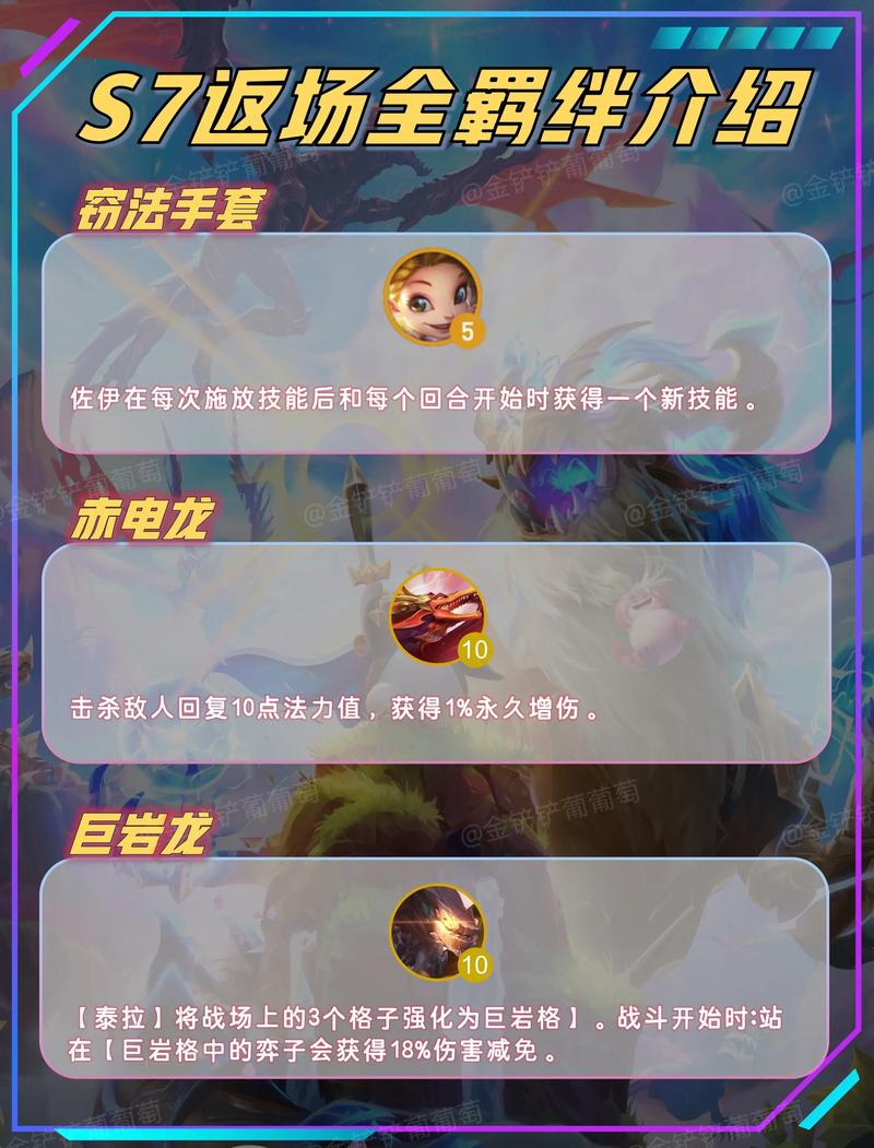 《金铲铲之战》S7赛季巨龙之巢新增羁绊效果一览 【金鳞龙】【金鳞龙】将赋予玩家使用由金币决定的独家【金鳞龙】装备的能力。更多装备将随羁绊人数『9』增加而解锁,每局装备出现的次序不同。