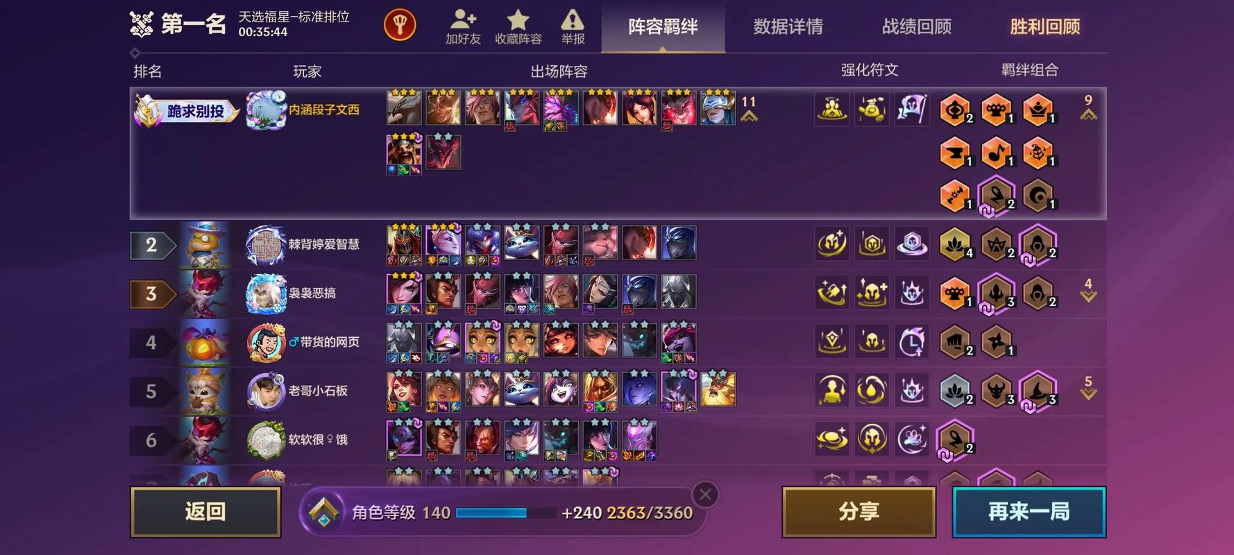 〖Four〗、云顶双城之战阵容: 盖伦:1费圣盾使;格雷福斯:1费枪手;卡特琳娜:2费刺客;蕾欧娜:3费保镖;拉克丝:4费黑魔法师;永恩:4费挑战者;悠米:5费猫猫、学者。在这个最用功的阵容里,七位好学的英雄一起登场,并祈祷能用【战斗学院纹章】或【海克斯强化】完成最终的8英雄羁绊。云顶之巅,聚梦之所。