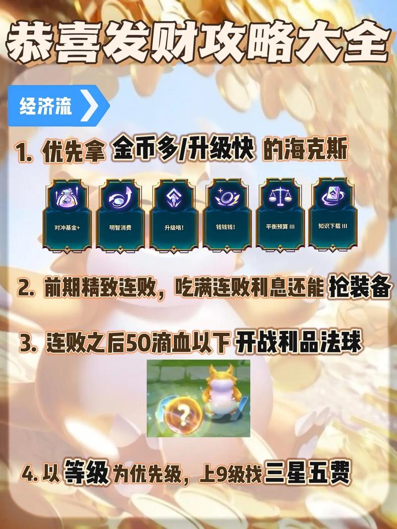 在金铲铲之战恭喜发财模式中,以五费卡开局的关键策略如下:前期运营 经济类海克斯强化:优先选用如“利滚利”“意外之财”等经济类海克斯强化,以快速积累金币。保持连胜或连败:通过合理的战斗策略,尽量保持连胜或连败,以获取更多的利息金币。