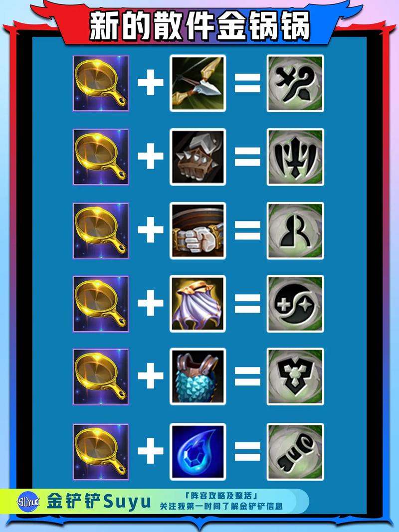 〖One〗、合成公式:大剑+金铲铲效果:使携带者获得神盾战士羁绊,提升队伍的防御和反击能力。法师羁绊:合成公式:法棒+金铲铲效果:使携带者获得法师羁绊,增强队伍的法术输出能力。复苏者羁绊:合成公式:女神之泪+金铲铲效果:使携带者获得复苏者羁绊,提升队伍的治疗效果和续航能力。
