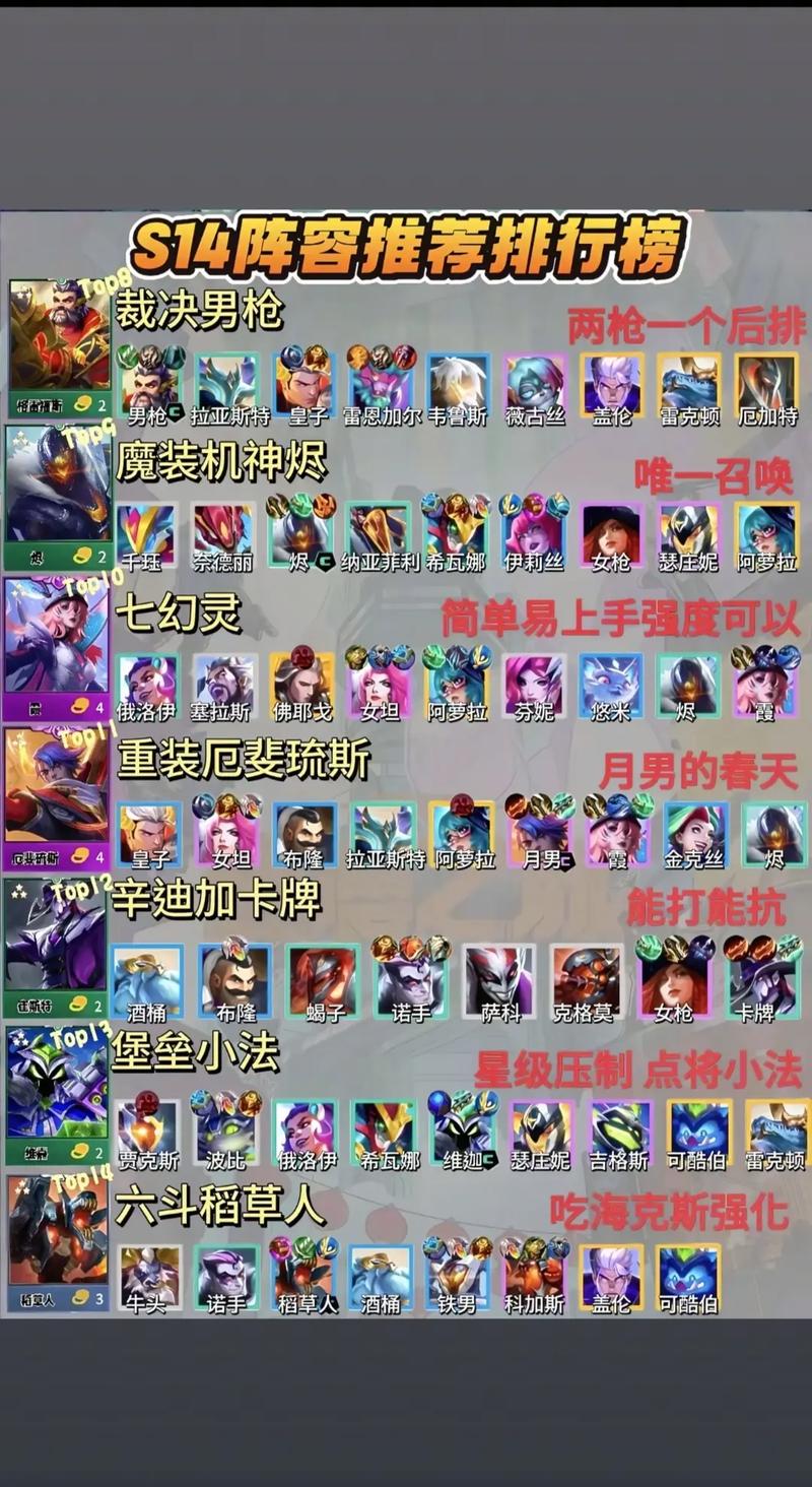 〖Two〗、推荐福牛九五阵容。此阵容是金铲铲S14中较强的上分阵容。阵容组成福牛九五通常会围绕福牛羁绊英雄搭配高费强力英雄。福牛英雄能提供不错的属性加成和团队增益效果,九五则强调使用5费卡英雄来提升整体阵容强度。不过具体英雄需结合游戏实际情况选取,一般会有像赛博城市等版本热门体系中的关键5费卡。
