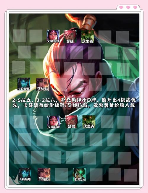 〖Five〗、极客九五阵容 核心思路:利用极客羁绊快速获取装备和经济优势,后期转型为九五至尊(即9人口全2星高费卡阵容)以碾压对手。关键英雄:吉格斯、维克托、金克丝等极客英雄,以及杰斯、塔姆等5费卡作为后期补充。装备推荐:优先合成无尽之刃、蓝霸符等提升输出能力的装备。