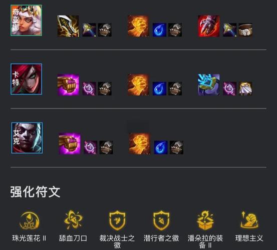 奇亚娜:无尽之刃、正义之手、泰坦的坚决。无尽和正义提供高爆发,泰坦增加生存能力。卡特:离子火花、珠光护手、正义之手。离子和珠光提升法术伤害,正义提供生命恢复。英雄之力与符文选取 英雄之力:确保奇亚娜和卡特的装备齐全,他们是阵容的关键输出点。