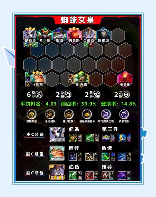 迭嘉:鬼索的狂暴之刃、幽影龙纹章。努努:日炎斗篷、救赎、石像鬼石板甲。亚索:巨人杀手、正义之手、泰坦的坚决。运营策略:前期:采取连胜策略,21升4人口,25升5人口,使用强势打工羁绊搭配系统给的卡。中期:32升6人口,小规模搜寻,保留关键英雄,优先保证经济稳定。
