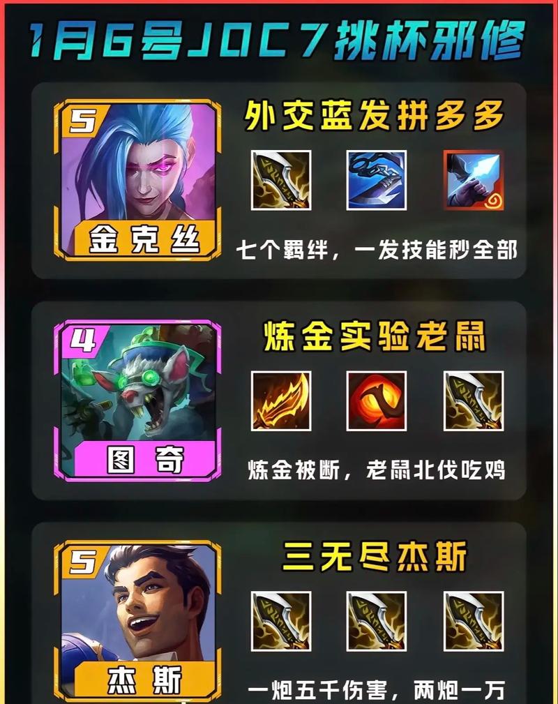 金克丝:羊刀(提供额外攻击速度,叠加至无限)、火炮(增加攻击距离,避免被近战英雄攻击)、锐利之刃(提升攻击力)。潘森:狂徒(增加大量生命值)、龙牙(提供魔法抗性)、反甲(反弹物理伤害)。运营思路 早期阶段:2阶段不拉人口,采取连败策略以快速积累经济。只保留阵容所需英雄牌。