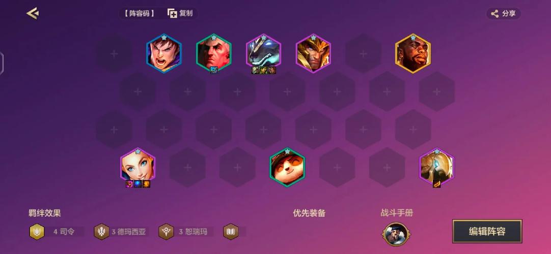 〖Three〗、阵容一推荐: 成员:德莱文、锐雯、艾克、瑟提、蕾欧娜、芮尔、贾克斯、孙悟空 羁绊:5战斗机甲、4护卫、2秘术卫士、2斗士、1精英战士 强化符文:优先选取猎律动、DD街区、狠利刃等能够提升战斗力和经济收益的符文。 装备配备: 德莱文:巨人杀手、无尽之刃、饮血之剑等输出装备,提升他的伤害能力。