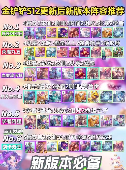 〖Two〗、《金铲铲之战》S12命运95阵容玩法攻略 阵容组成 核心英雄:泽拉斯、贝蕾亚、莫甘娜、丁真、洛、皎月、塔姆、人马、妮蔻。羁绊搭配:1飞升者、1蝙蝠女王、1狂厄蔷薇、4命运、2花仙、2女巫、2堡垒、2复苏、2学者、2换形。这套阵容通过多元化的羁绊搭配,形成强大的综合战斗力。