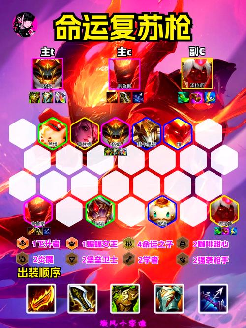 副核心英雄应与核心英雄相辅相成,提高整体阵容的输出和生存能力。剑魔、剑圣、剑姬等英雄是不错的选取。前排坦克搭配 前排坦克英雄应具备较高的生存能力,为后排输出英雄提供保护。石头人、猪妹等英雄能够很好地胜任这一角色。输出辅助搭配 输出辅助英雄应具备较高的输出能力,为后排输出英雄提供火力支援。