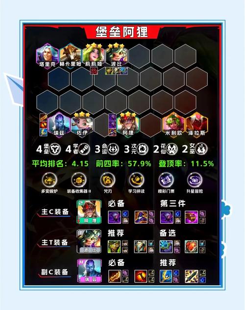 〖Four〗、水晶95阵容(版本之子)羁绊组成:7水晶玫瑰 + 2护卫 + 2主宰 + 1星守。核心棋子:寒冰(主C)、乌鸦(主坦)、布隆(副坦)。运营思路:前期连败攒经济,4-2阶段拉8级D出两星寒冰,后期补5费卡提升上限。至高天九五阵容(后期无敌)羁绊组成:6至高天 + 2决斗 + 2狙神。