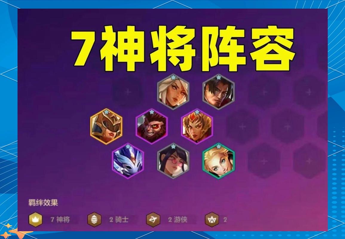 天罚弩神 驭影双生 虚空之女 星龙战神 曙光神将 虚空恐惧 不屈战神 齐天大圣 圣光战神 核心羁绊包括: 2护卫 5神将 4游侠 2虚空 2斗士 2骑士 阵容解析 核心打法聚焦于追到3星的天罚弩神。