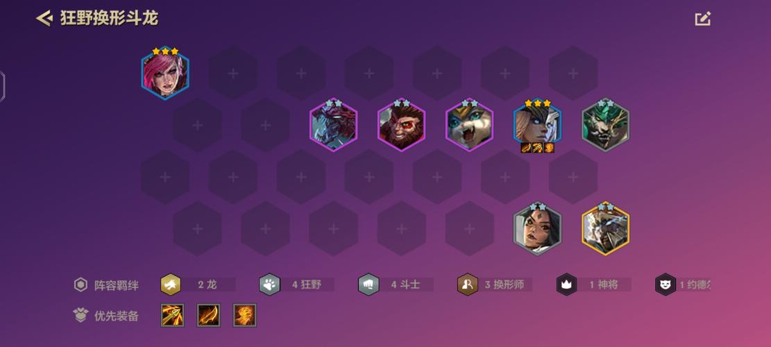 〖Two〗、金铲铲之战s1狂野斗士玩法及时空裂痕狂野阵容推荐:阵容组成 核心英雄:逆血战姬(龙女)、北境之傲(狮子狗)、虚空恐惧(大虫子)、未来守护者(杰斯)、狻猊之心(纳尔)、南天之怒(狼人)、皮城执法官(蔚)、悟空(猴子)。羁绊搭配:4狂野、4斗士、3换形师、2海克斯科技。
