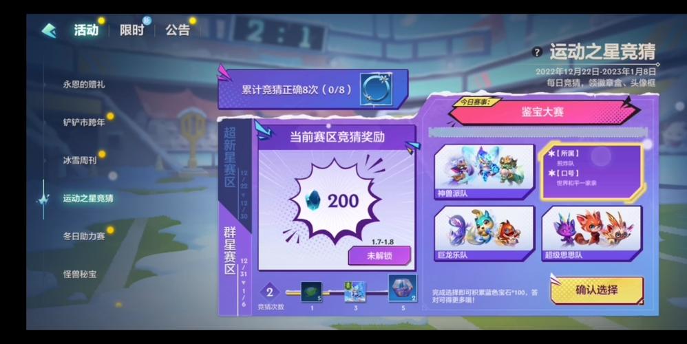 巨龙乐队:近来战绩(1胜,今日获胜)。超级思思队:近来战绩(1胜,2日获胜)。活动介绍:每天玩家需要选取一个队加入,选取正确即可获得奖励。活动时间:122日-8日 奖励一览:竞猜正确8次即可获得头像框,参与5次获得勋章盒。