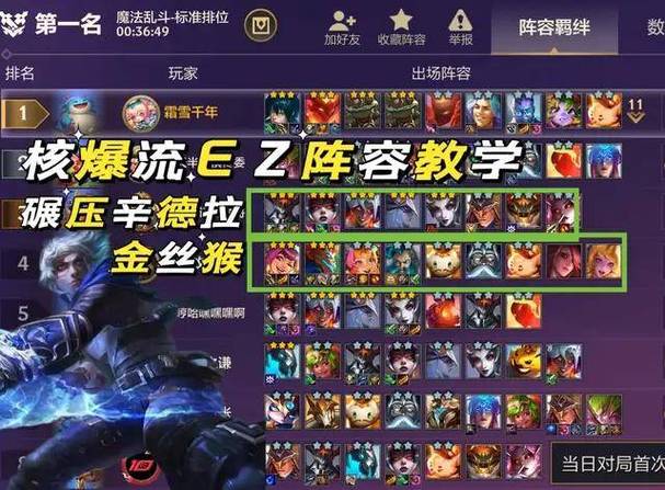 金铲铲之战爵士EZ95阵容的搭配方法如下:核心棋子 未来守护者EZ:作为阵容的主C,EZ的技能伤害极高,是团战中的主要输出点。必备装备为蓝buff和法爆,可以最大化其技能伤害,大帽子也是不错的选取,能进一步提高法术强度。辅助棋子 宝石:作为辅助,为EZ提供护盾和回血,增强其生存能力。