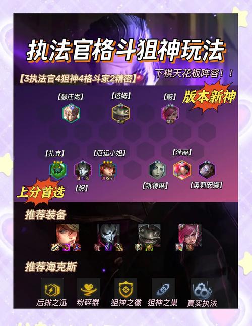〖Two〗、阵容组成与羁绊分析 阵容组成:凯特琳、瑟庄妮、艾希、厄运小姐、蔚、烬、杰斯、奥莉安娜。搭配4狙神、5执法官、2精密发条、2格斗家羁绊(需要执法官之心或纹章)。若有狙神纹章,可将奥莉安娜替换为泽丽,组成6狙神羁绊。