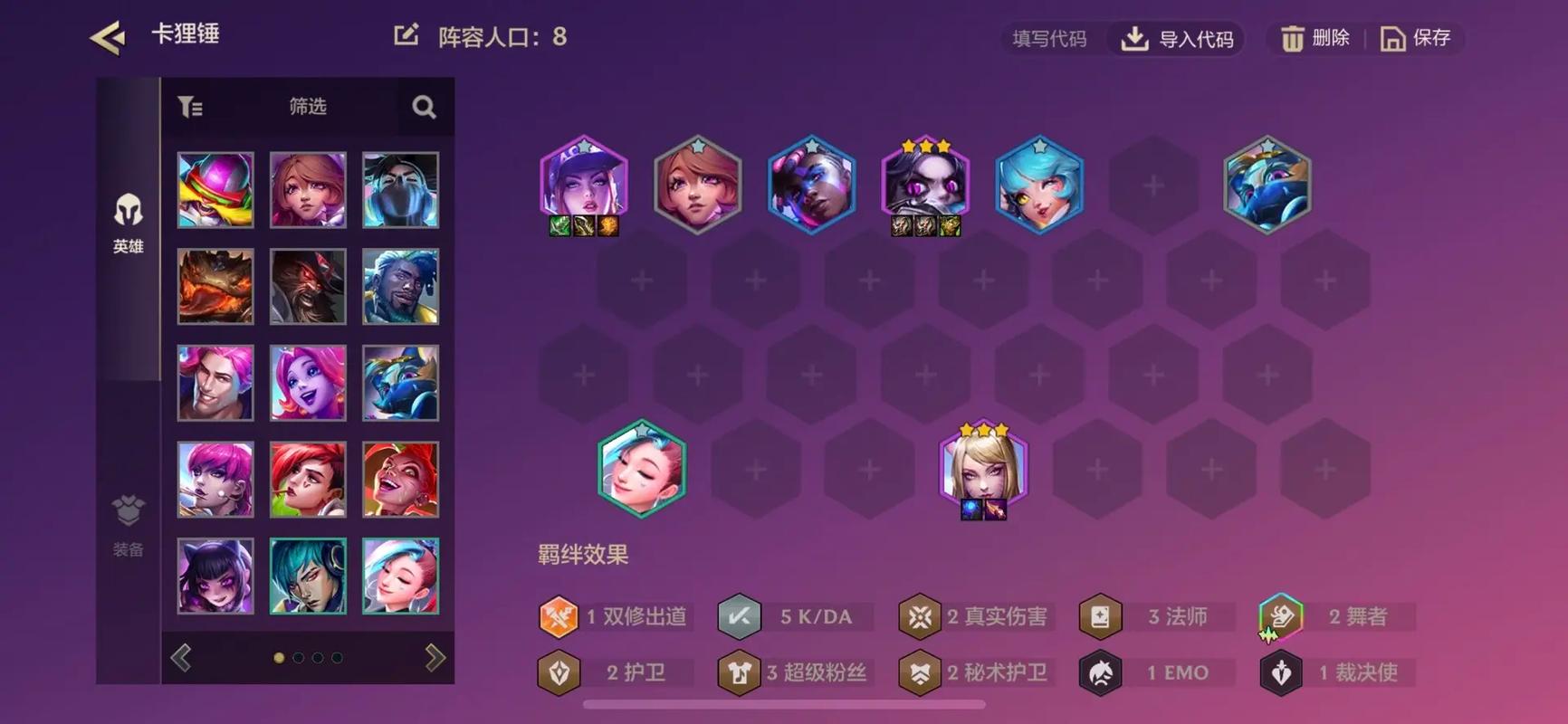 副核心英雄应与核心英雄相辅相成,提高整体阵容的输出和生存能力。剑魔、剑圣、剑姬等英雄是不错的选取。前排坦克搭配 前排坦克英雄应具备较高的生存能力,为后排输出英雄提供保护。石头人、猪妹等英雄能够很好地胜任这一角色。输出辅助搭配 输出辅助英雄应具备较高的输出能力,为后排输出英雄提供火力支援。