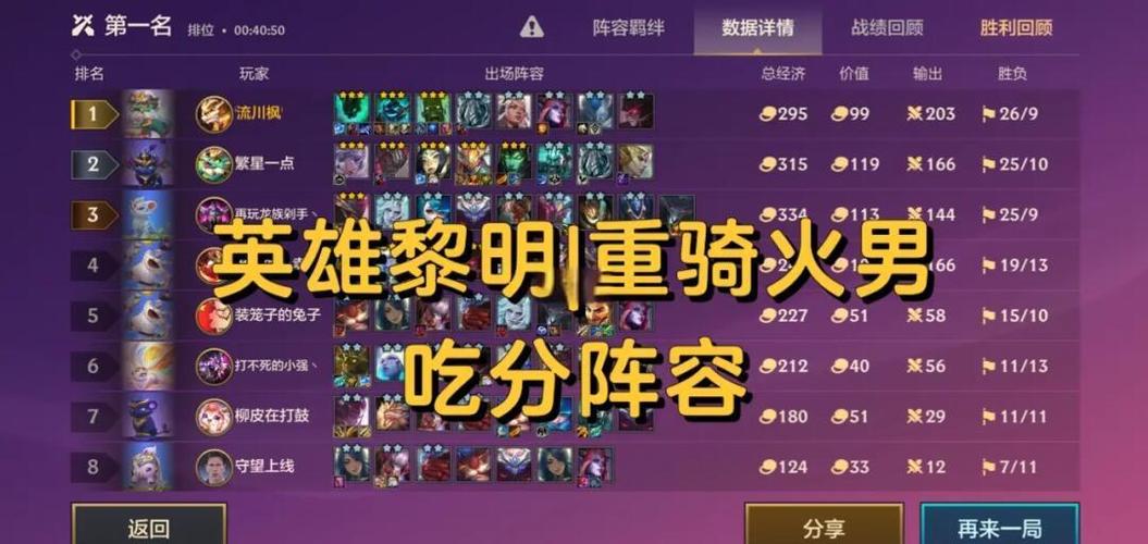 驯龙高手阵容 核心思路:利用驯龙大师和龙族的羁绊,快速召唤出强大的龙魂,形成强大的战斗力。关键英雄:赛娜、艾希、崔丝塔娜等驯龙大师,以及诺姆希等龙族英雄。装备推荐:优先给核心输出英雄如赛娜或崔丝塔娜配备攻速和攻击力装备,如无尽之刃、最后的轻语等。