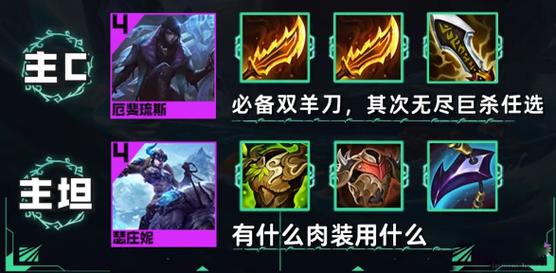 〖Two〗、厄斐琉斯(主C):优先装备鬼索的狂暴之刃,如果攻速不足,可考虑双鬼索。最后一件装备可选取无尽之刃、巨人捕手或锐利之刃等,以提升其输出能力。瑟庄妮(主坦):推荐装备狂徒铠甲、荆棘之甲和巨龙之爪,这些装备能够显著提升瑟庄妮的生存能力和对敌方造成的伤害反弹。