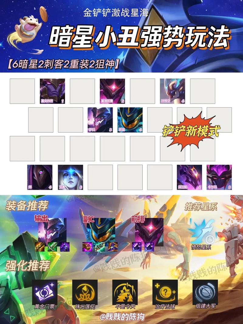 〖Six〗、金铲铲之战s14杀手小丑阵容搭配方案如下:阵容构成 核心英雄:小丑(必备),搭配凯隐、卡特琳娜、阿卡丽、寡妇、男刀、蛇女,八人口时补第二个小丑。羁绊解读 6刺客:提供大幅攻击力加成,战斗开始时跳向敌方后排,瞬间造成巨大威胁。小丑作为主C,能在敌方后排疯狂输出。
