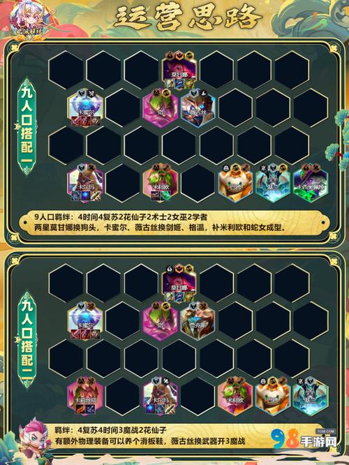 阵容组成 该阵容由尼菈、狗头、皇子、女枪、沙皇、泰坦、诺手、剑魔组成,构成4主宰、3司令、1暗裔、2征服者、2恕瑞玛、3比尔吉沃特的羁绊组合。装备搭配 抢装顺序:优先拿大剑和反曲弓,用于合成火炮和饮血剑。核心装备:尼菈的核心装备是火炮,其次是回复装。