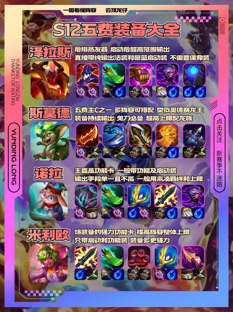 主C莫甘娜:朔极之矛+大天使之杖+巨人捕手/珠光护手(朔极之矛启动快,大天使之杖加时赛无敌,最后一件补充伤害)。主坦拉莫斯:荆棘之甲+巨龙之爪+狂徒铠甲(荆棘之甲必备,巨龙之爪应对魔法阵容,狂徒铠甲增加坦度)。副C费德提克:离子火花+巨人捕手+珠光护手(提供控制与额外伤害)。