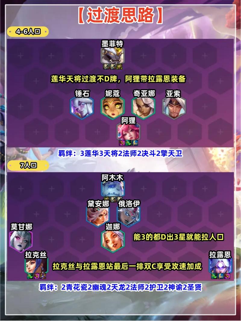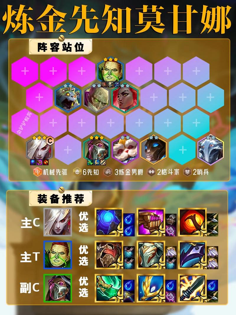 〖One〗、核心棋子:莫甘娜、图奇、盖伦、慎、艾希、锤石羁绊搭配:6先知(全员80%回蓝,莫甘娜技能释放频率极高)、2哨兵(增强前排坦度)、2秘术(提供额外魔抗,增强生存能力)装备推荐 主C莫甘娜:核心装备为科技枪(提供吸血能力)、青龙刀(加快回蓝速度)、法爆(提升技能伤害)。