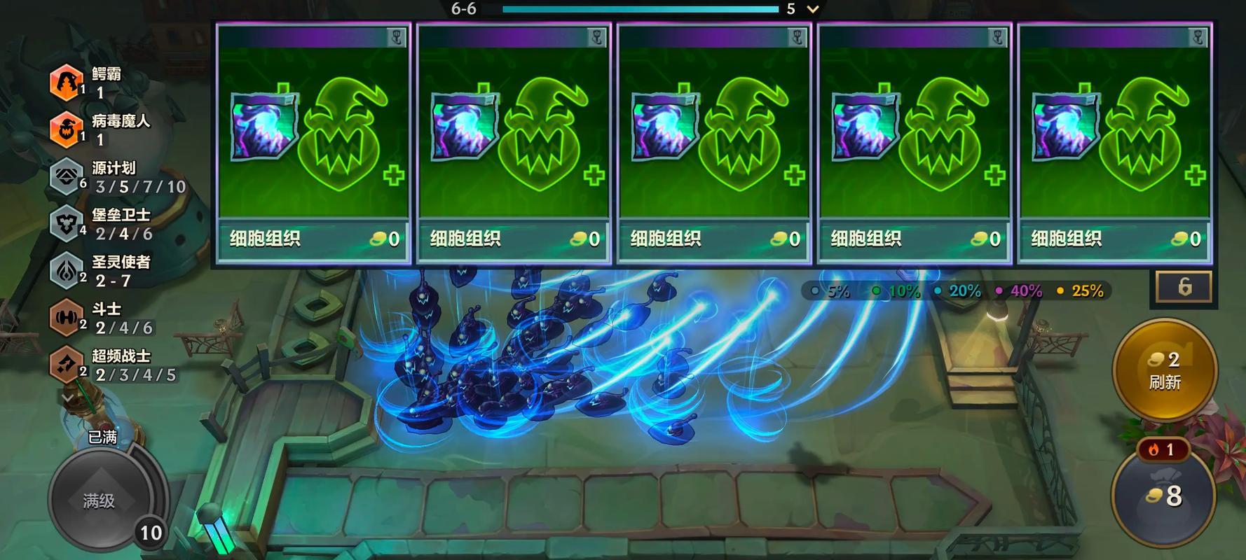 〖Five〗、羁绊:鳄霸、圣灵使者、堡垒卫士技能:获得最大生命值提升并造成物理伤害。对2格内的敌人造成灼烧持续5秒。技能释放分为两个阶段:第一次释放技能进入狂暴状态,普攻攻击两次;第二次释放技能再次进入狂暴状态,普攻攻击三次。下面不会再释放技能。