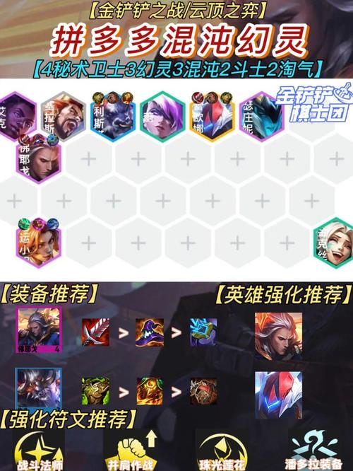 金铲铲之战s7神龙蜘蛛阵容搭配攻略如下:阵容组成 核心英雄:卡尔玛、瑟提、艾希、沃利贝尔、李青、伊莉丝(蜘蛛)、斯维因。备选英雄:根据海克斯强化和装备情况,可以选取奥恩或妮蔻作为前排坦克,亚索作为副C增强阵容输出。阵容羁绊 主要羁绊:9神龙尊者,提供高额的攻击力和法术强度加成,极大提升蜘蛛的输出能力。