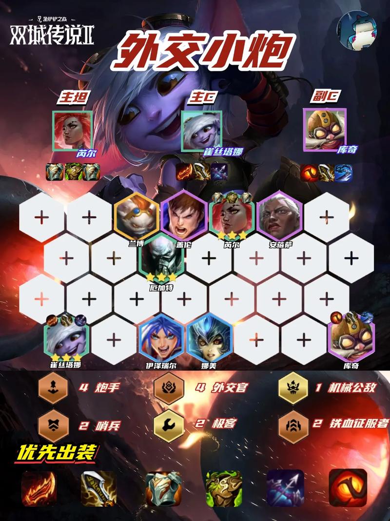 〖Two〗、物理输出装备可以给小炮、法师装备可以给佐伊,最后前排可以带肉装。使其打工过渡也非常丝滑,不仅可以一边凑羁绊,还可以在前期稳定血量,打出连胜。第二套阵容需要用到机器人、莉莉娅、小炮、克格莫、兰博、努努和金克斯,一共可以开出二重装、三小蜜蜂、二强袭、二咖啡、二猎手、二堡垒和二花仙子。
