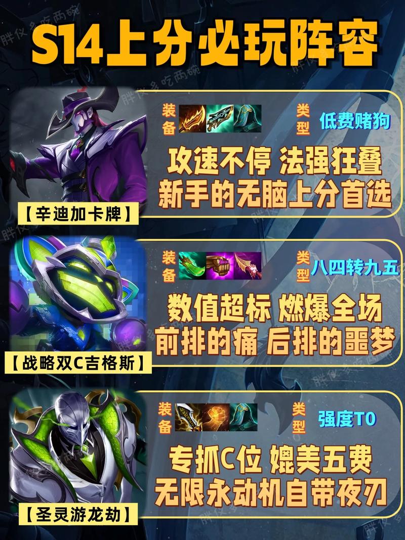 〖One〗、月神猎:该阵容以月神为核心,搭配猎人羁绊,拥有强大的输出能力和生存能力。通过合理的装备分配和技能选取,可以轻松应对各种敌人。赌提莫:这是一套非常强势的阵容,拥有极高的前四率和吃鸡率。提莫的隐身和毒蘑菇技能让敌人难以捉摸,配合其他英雄的控制和输出,可以迅速击败对手。