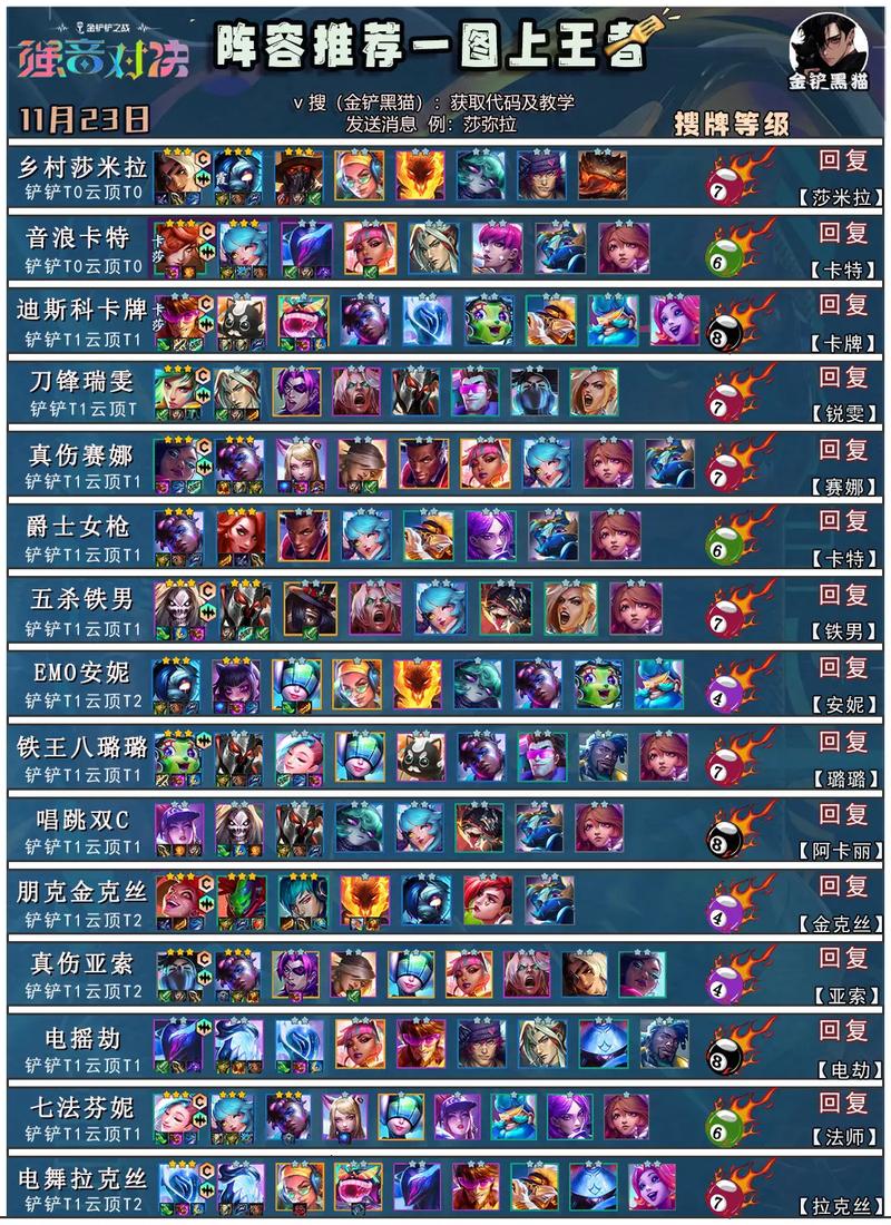 〖Six〗、金铲铲之战新赛季中,以下阵容较为强势:六骑天使阵容:核心羁绊:六骑士与三圣光卫士。阵容组成:盖伦、贾克斯、加里奥、凯尔(天使)、薇恩、奎因,以及蕾欧娜。阵容优势:此阵容拥有强大的前排坦度与后排输出能力,天使作为核心输出,在装备成型后能打出极高的伤害。