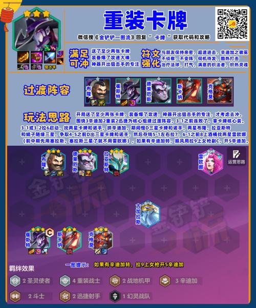 〖Four〗、在《金铲铲之战》S15赛季中,针对“羁绊追踪者”挑战,以下是一个相对简单且有效的阵容推荐:核心阵容 莎弥拉:作为阵容的主要输出点,莎弥拉的高爆发能力能够迅速削减敌方血量,为团队创造优势。