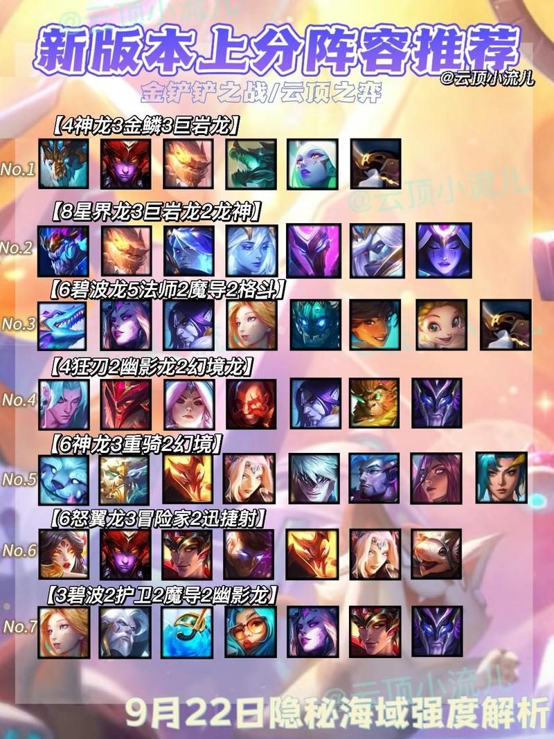 〖Three〗、神谕卡尔玛阵容 特点:简单好上手,适合新手。核心英雄:卡尔玛(主C),慎(主坦)。羁绊效果:以神谕者为主,搭配艾欧尼亚等羁绊。装备推荐:卡尔玛装备法爆、巨杀、科技枪;慎装备龙牙、反甲、狂徒。诺克双C阵容 特点:肉盾与输出并存,稳稳吃分。核心英雄:德莱厄斯(诺手,主C),卡特(副C)。