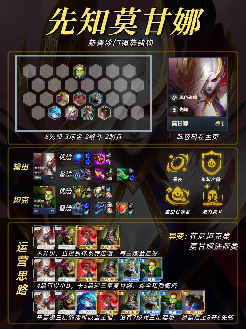 天选推荐:天选玉剑男刀或刺客男刀时,可以强化阵容输出;宗师天选也是不错的选取,增强阵容控制。装备搭配 男刀装备:复活甲、破甲弓、无尽为男刀的标准三件套,提供生存、破防和高额输出能力。备选装备包括正义之手、巨杀等输出装。莫甘娜装备:鬼书和复活甲为莫甘娜的核心装备,提供法术输出和控制能力。