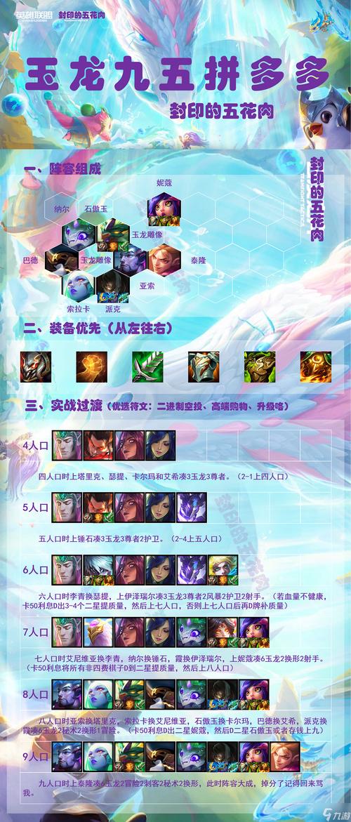 阵容组成与装备分配 阵容组成:妮蔻、石傲玉、凤凰、巴德、纳尔、艾希、索拉卡、卡尔马。该阵容以玉龙为核心,搭配高输出的凤凰作为主C。装备分配:凤凰:必备青龙刀和大天使,提供回蓝和法术强度,最后一件可选巨杀、科技枪或帽子,根据对手阵容灵活选取。