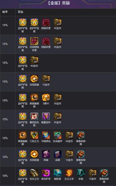 %的概率下,金蛋会包含两件金铲铲冠冕、偷窃手套和20G,或是金铲铲冠冕、光明偷偷、偷偷和15G的组合,这些都是极具价值的装备。另一种15%的概率中,金蛋可能开出光明装备、奥恩神器、散件、两件5费英雄和拆卸工具,以及额外的10G,这能极大地提升玩家的战力。