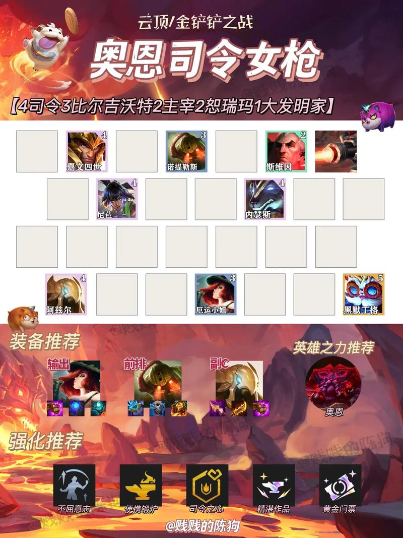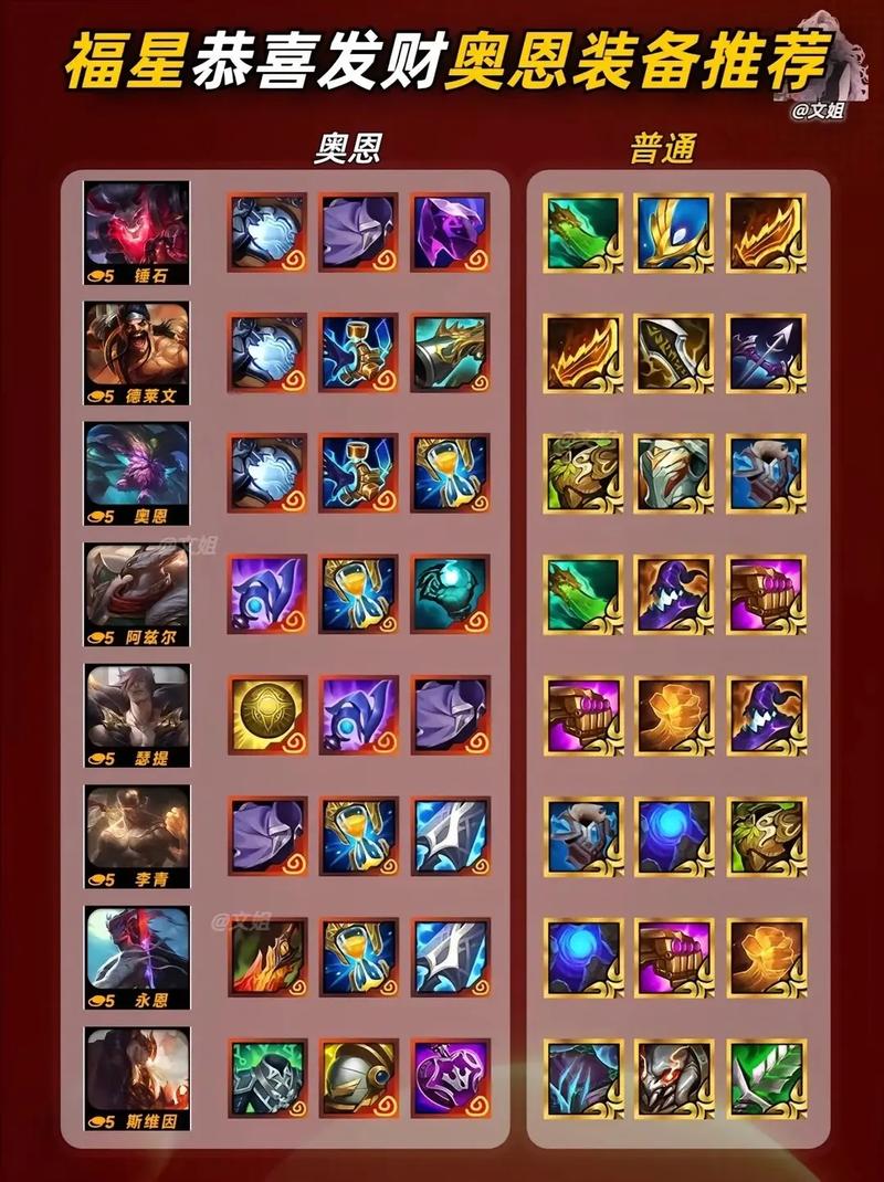 《金铲铲之战》恭喜发财诡术师之镜奥恩搭配推荐如下:阵容组成 主要成员:猪妹、奥恩、洛、努努、大树、千珏、天使、霞、露露这个阵容结合了控制、坦度、输出和辅助,能够应对多种战斗场景。羁绊组成 1铁匠:奥恩,提供独特的装备锻造能力。4裁决使:霞等裁决使英雄,提供高额的百分比伤害。