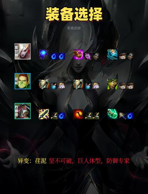 装备选取:主C莫甘娜:朔极之矛+大天使之杖+巨人捕手/珠光护手,优先做出大天使之杖和朔极之矛,最后一件装备可根据实际情况选取。主坦拉莫斯:荆棘之甲+巨龙之爪+狂徒铠甲,以肉装为主,荆棘之甲必备。副C费德提克:离子火花+巨人捕手+珠光护手,提供额外的伤害和控制能力。